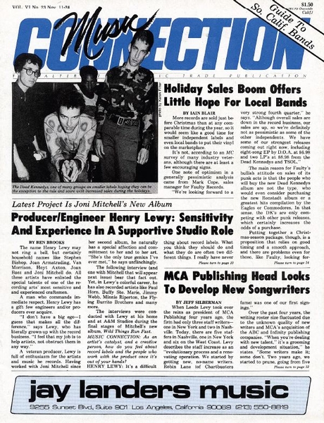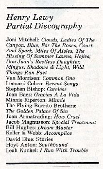 The following interview (and one with Mitchell that will appear next issue) bear that fact out. Yet, in Lewy's colorful career, he has also recorded artists like Paul Horn, Buffy Ste. Marie, Jimmy Webb, Minnie Riperton, the Flying Burrito Brothers and many more. The interviews were conducted with Lewy at his home and at A&M Studios during the final stages of Mitchell's new album,