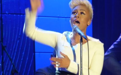 Otherwise the annual pre Grammy dinner was a rousing success, with a much lighter atmosphere than last year, and supercharged with A listers galore in the audience and top notch talent on stage that included Usher, Miguel, The Lumineers, Emeli Sande (pictured), Patti Smith and Lenny Kaye, Jennifer Hudson and the absolutely amazing Gladys Knight.