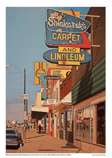 At a rest stop in front of the Jim Patterson special bank, we should put down the bicycles and step onto the fine gravel. The river and the small skyline shimmer here in the winter light of the Northern Lights, energetic, erratic, unique - a sign of how much Joni Mitchell, whose exuberant personality was simply not made to stay in Saskatoon for life, is now residing in British Columbia and "California". Track number six on her album "Blue". Christoph Moeskes