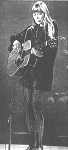 Joni had taught herself the guitar from a Pete Seeger manual (never finished, which helps account for some singular fingering with her left hand), and she left the prairies when she was 19. Since then she has played in Toronto at the now-defunct Gate of Cleve and the Seven of Clubs; and at the Penny Farthing, as well as the Riverboat.
